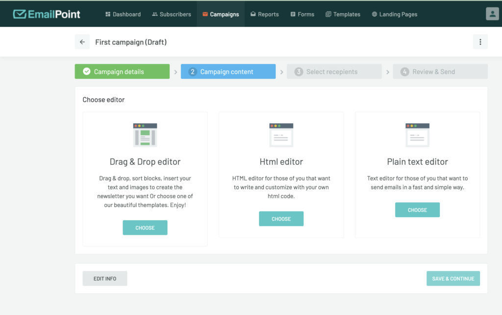 - Choose how you want to create your email – Drag&Drop Editor, HTML Editor or Plain text Editor.