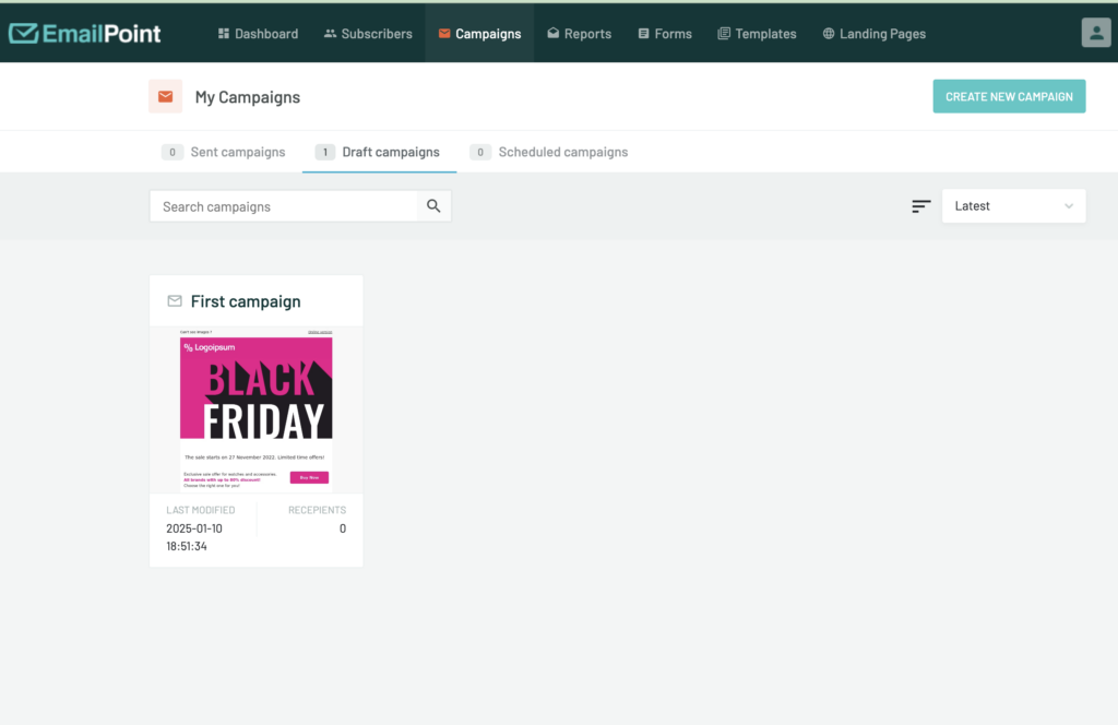 - In Draft Campaigns you will be able to see all your prepared emails that are not sent yet.