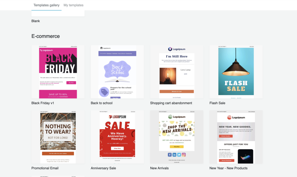 • Pre-designed Templates: Professionally designed layouts ready for customization. After you have named your template, you will be redirected to our Template Gallery. You can choose between multiple categories like E-commerce, Events, Holiday, Offers and Deals, Newsletters and other. Simply find the design you like and click “Choose” to edit it and customize for your business in our Drag&Drop Editor.